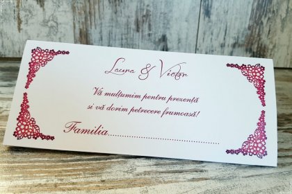 Buna ziua! Astazi a primit invitatiile de nunta comandate la dumneavoastra pe site. Fiind atat de ieftine, nun e faceam prea multe asteptari. Am ramas insa uimiti de calitatea lor. Sunt pur si simplu superbe! Toata lumea va fi incantata.
