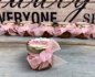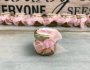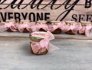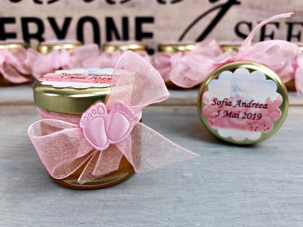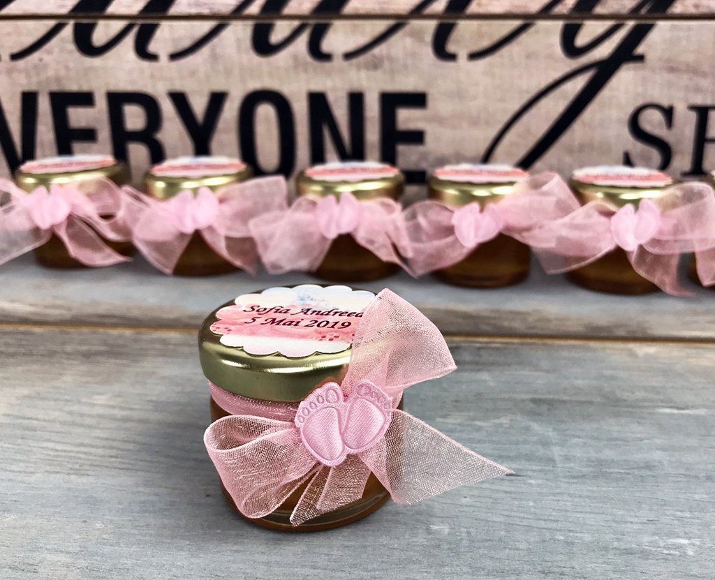Borcanasul cu miere este legat cu o fundita din panglica de organza roz si accesorizat cu doua picioruse roz de bebelus.