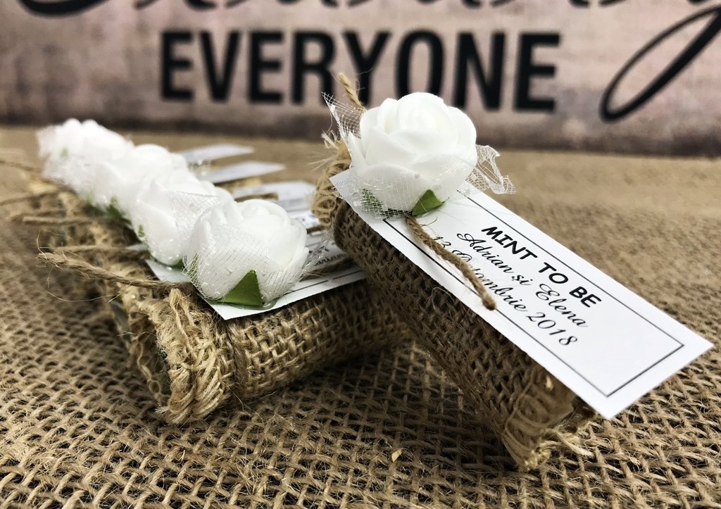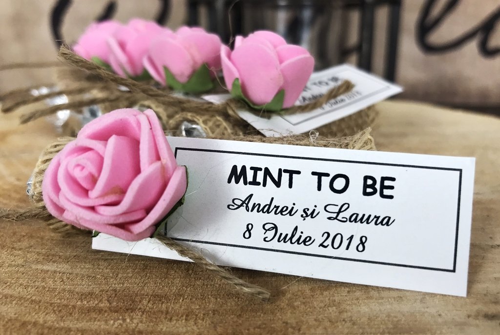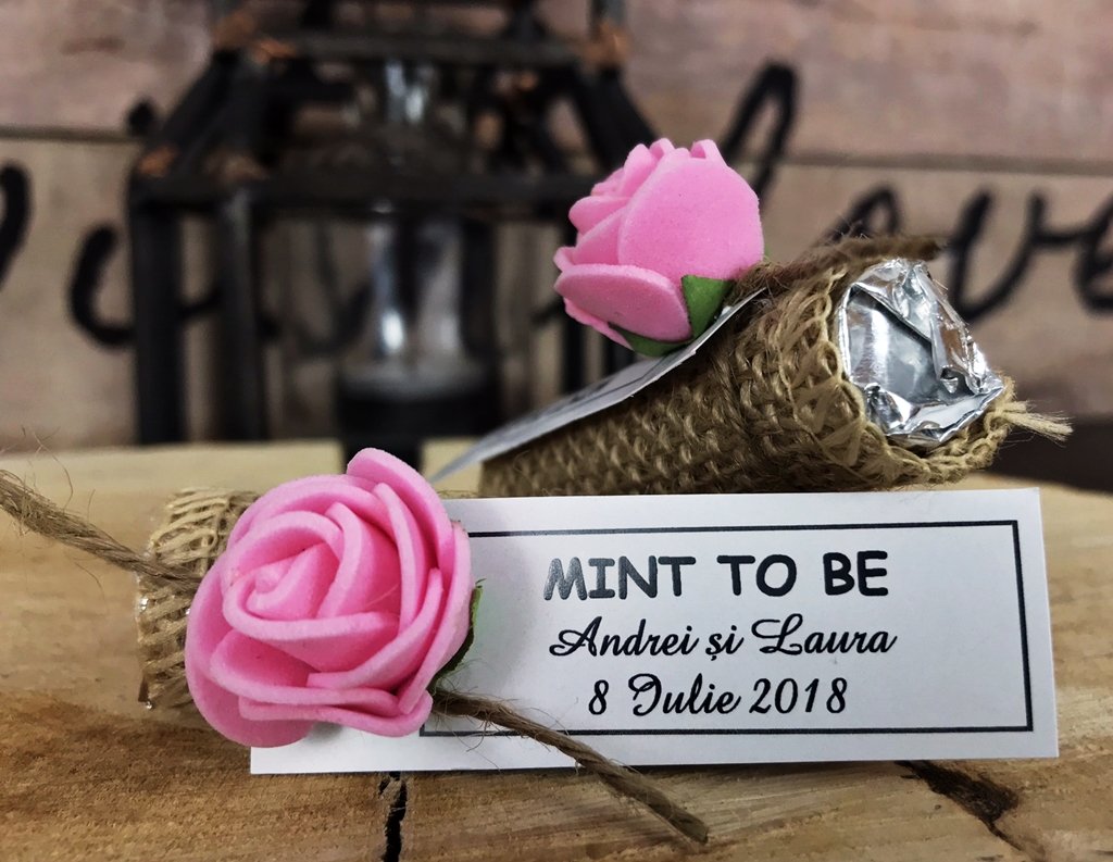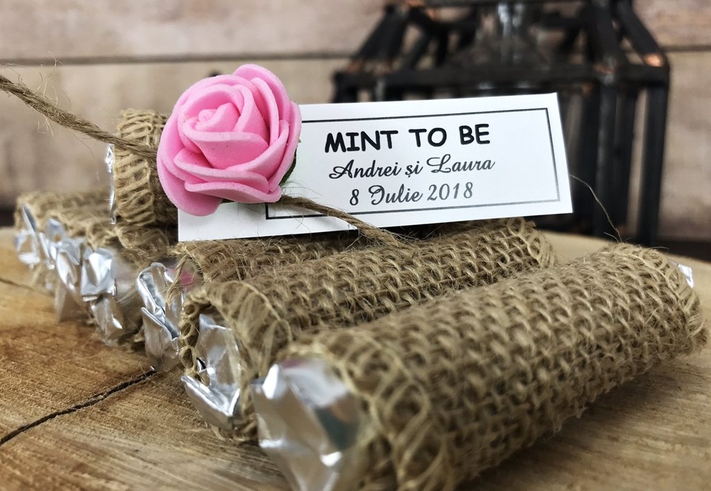 Bomboanele mentolate sunt invelite cu grija in panza naturala de iuta si accesorizate cu un trandafiras colorat. Marturiile sunt personalizate cu o eticheta cu numele mirilor & data evenimentulu insotite de mesajul MINT to BE.