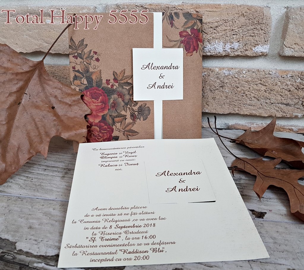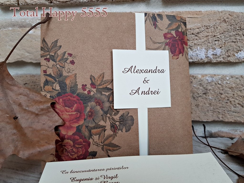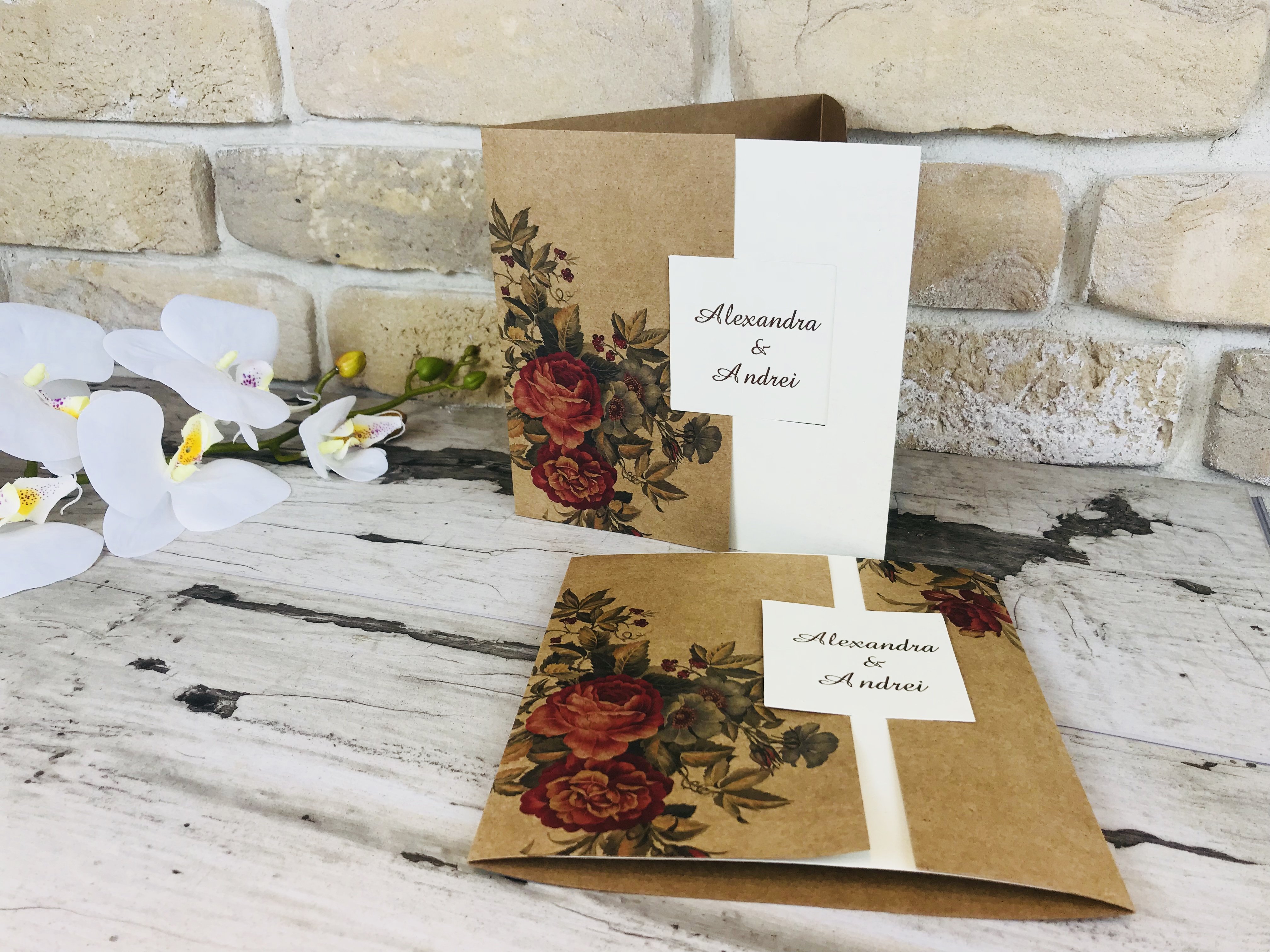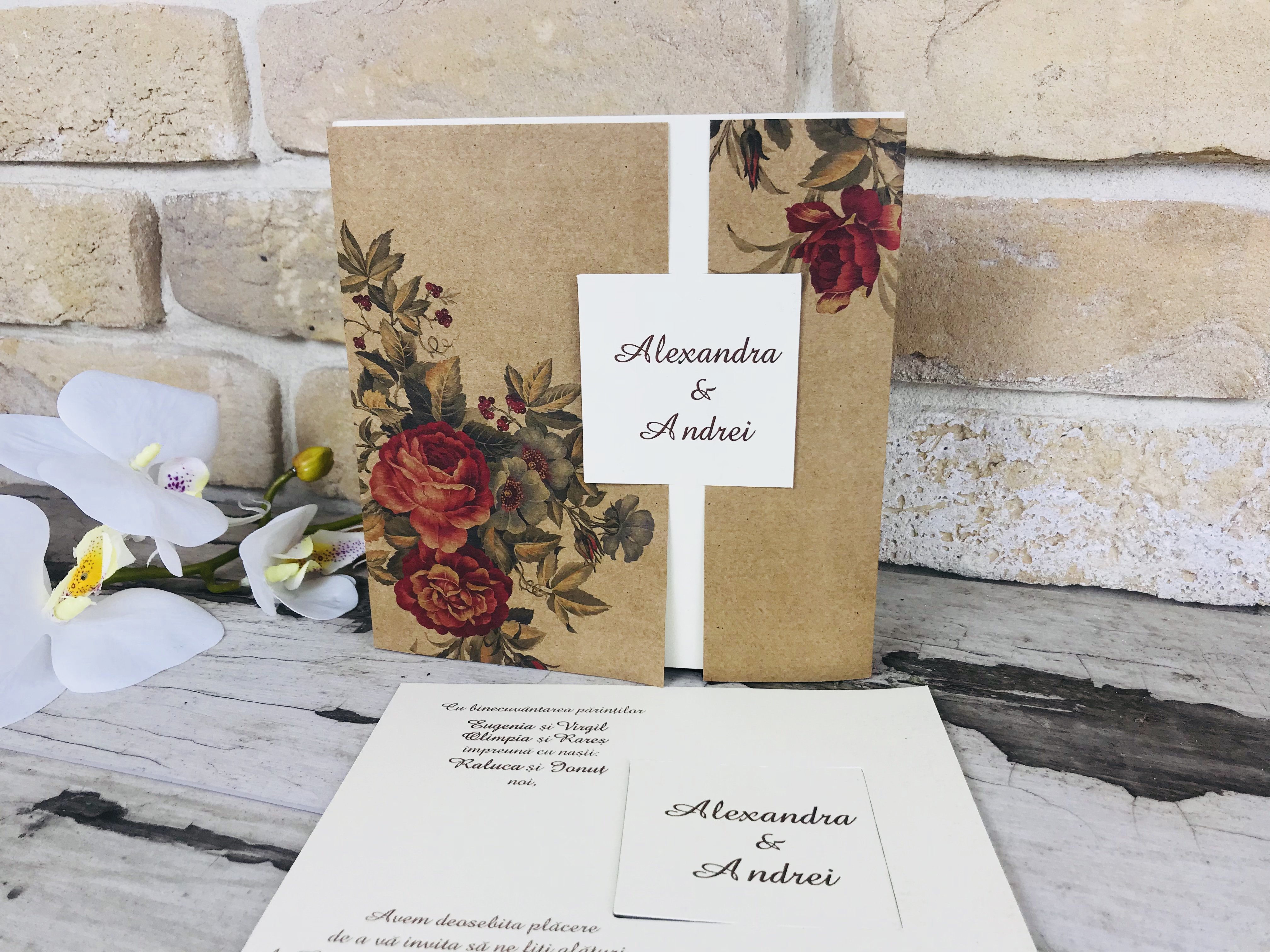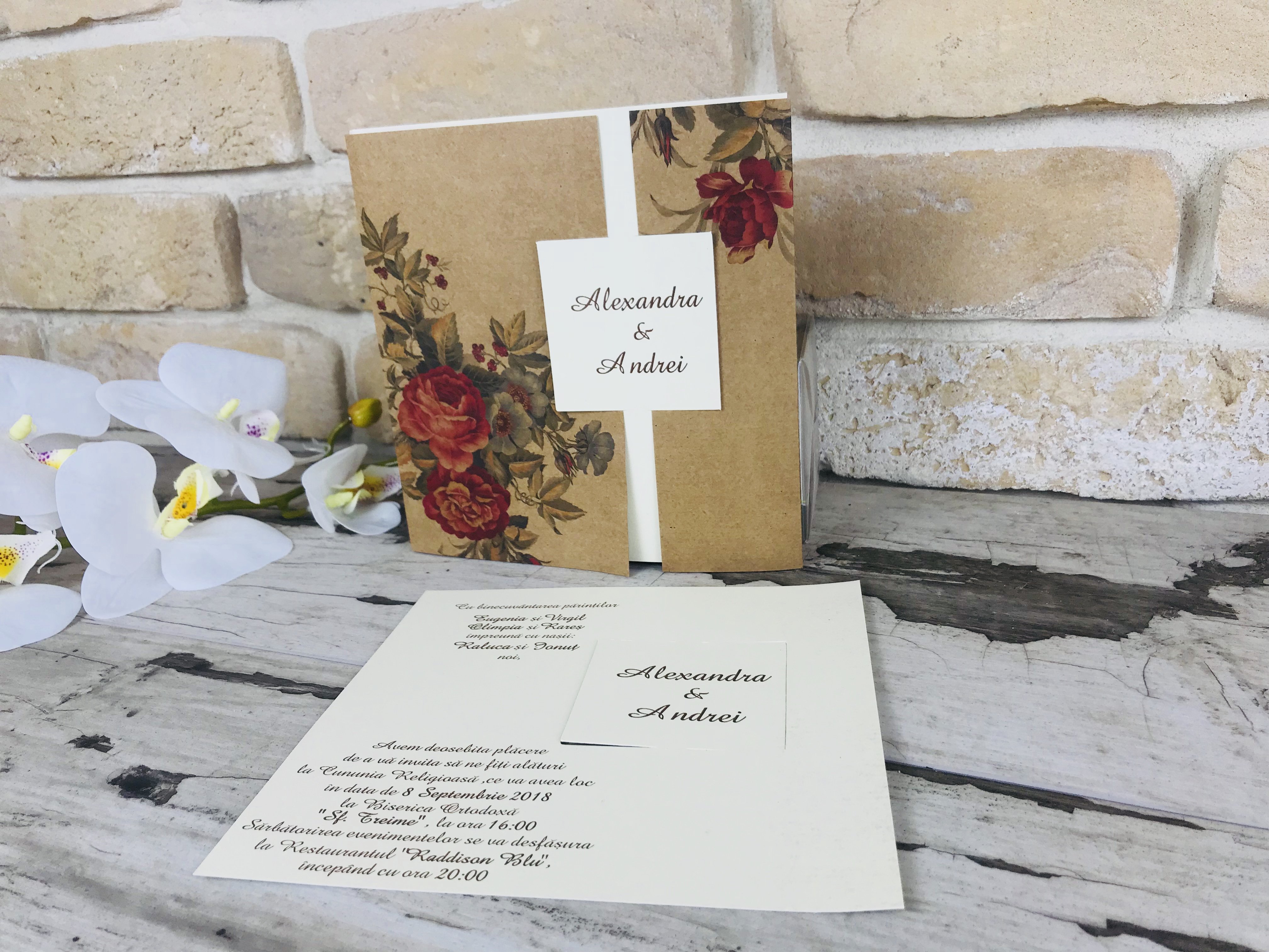 Invitatie eleganta din carton crem mat pe care se tipareste textul si care se ascunde in spatele exteriorului din carton kraft. Cartonasul pe care se tipareste numele este decupat din partea interioara a cartonului pentru text si scos in exterior unde se intalnesc marginile exterioare cartonului kraft.