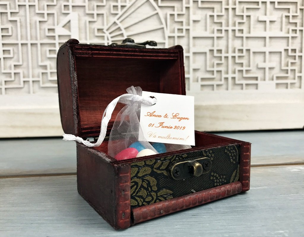 Cufarul poate fi umplut cu bomboane de ciocolata sau arahide glauzurate in zahar. Se poate personaliza cu numele mirilor si data evenimentului. Cost personalizare cu eticheta: 0.6 lei/buc.