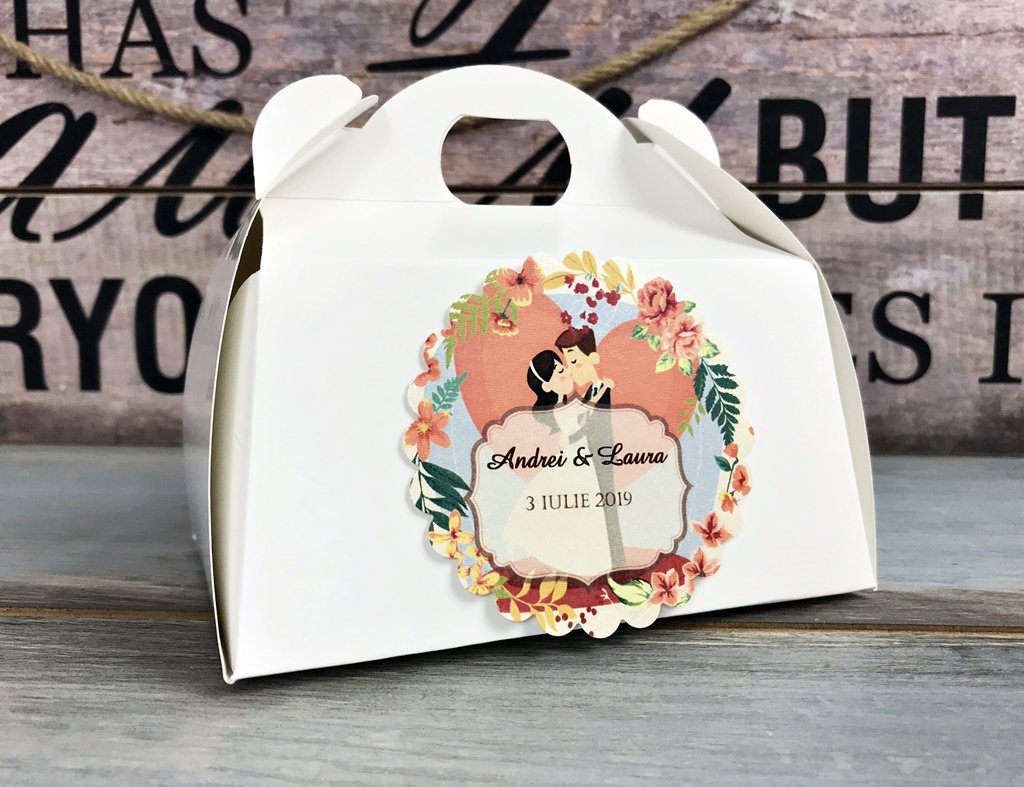 Optional, se poate personalizata cu eticheta ca in imagine cu numele mirilor & data evenimentului si un mesaj de multumire.