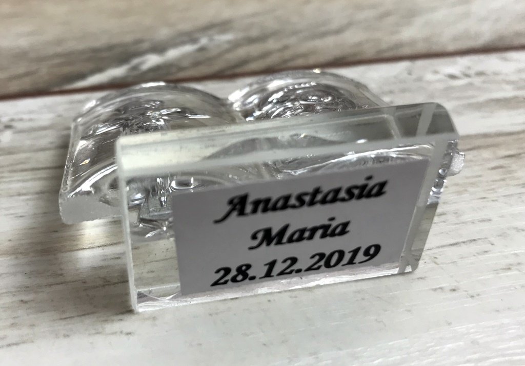Iconita este ambalata intr-o cutie transparenta si legata cu o fundita asortate roz sau blue, la alegere. Invitatii care vor primi aceasta marturie vor fi protejati de spiritele rele, la fel ca si copilasul care primeste taina botezului.