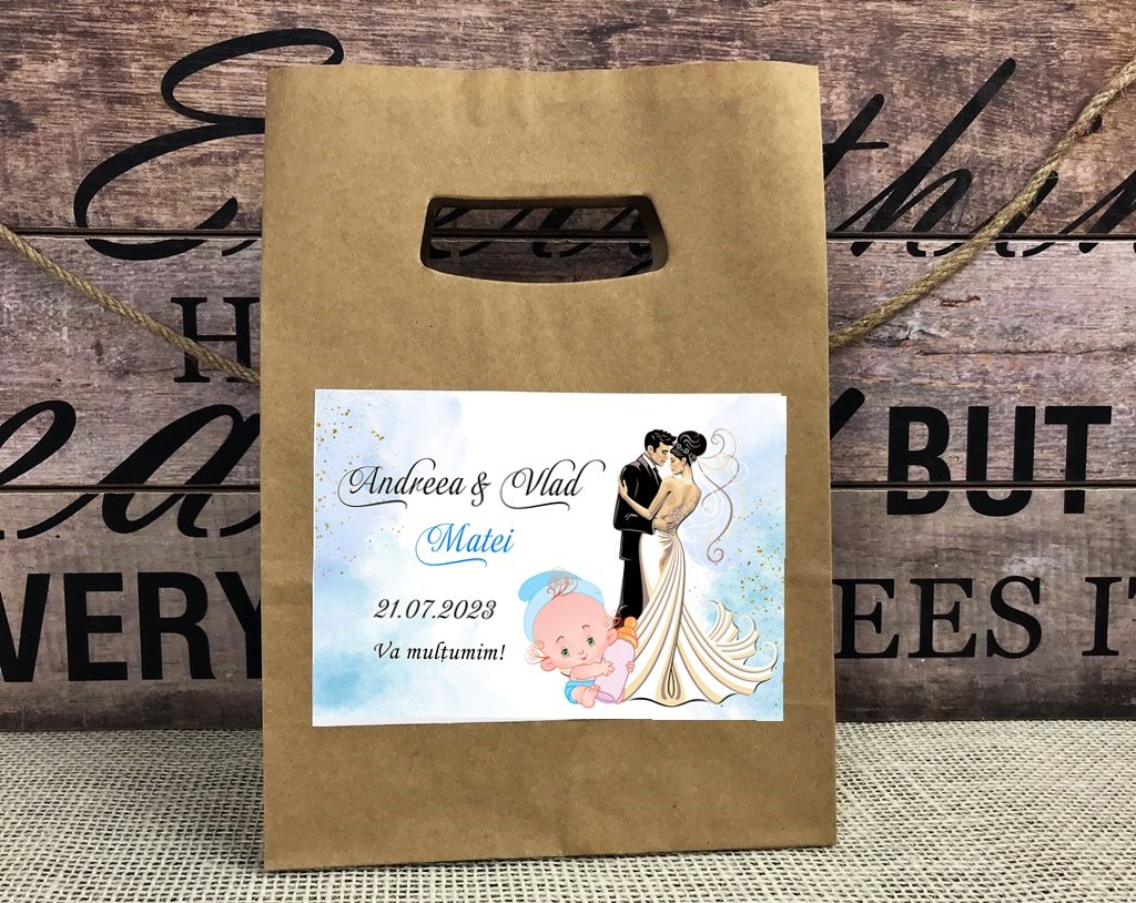 Punga este accesorizata cu o eticheta  personalizata cu numele  mirilor, al bebelusului si data evenimentului.