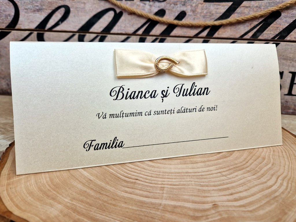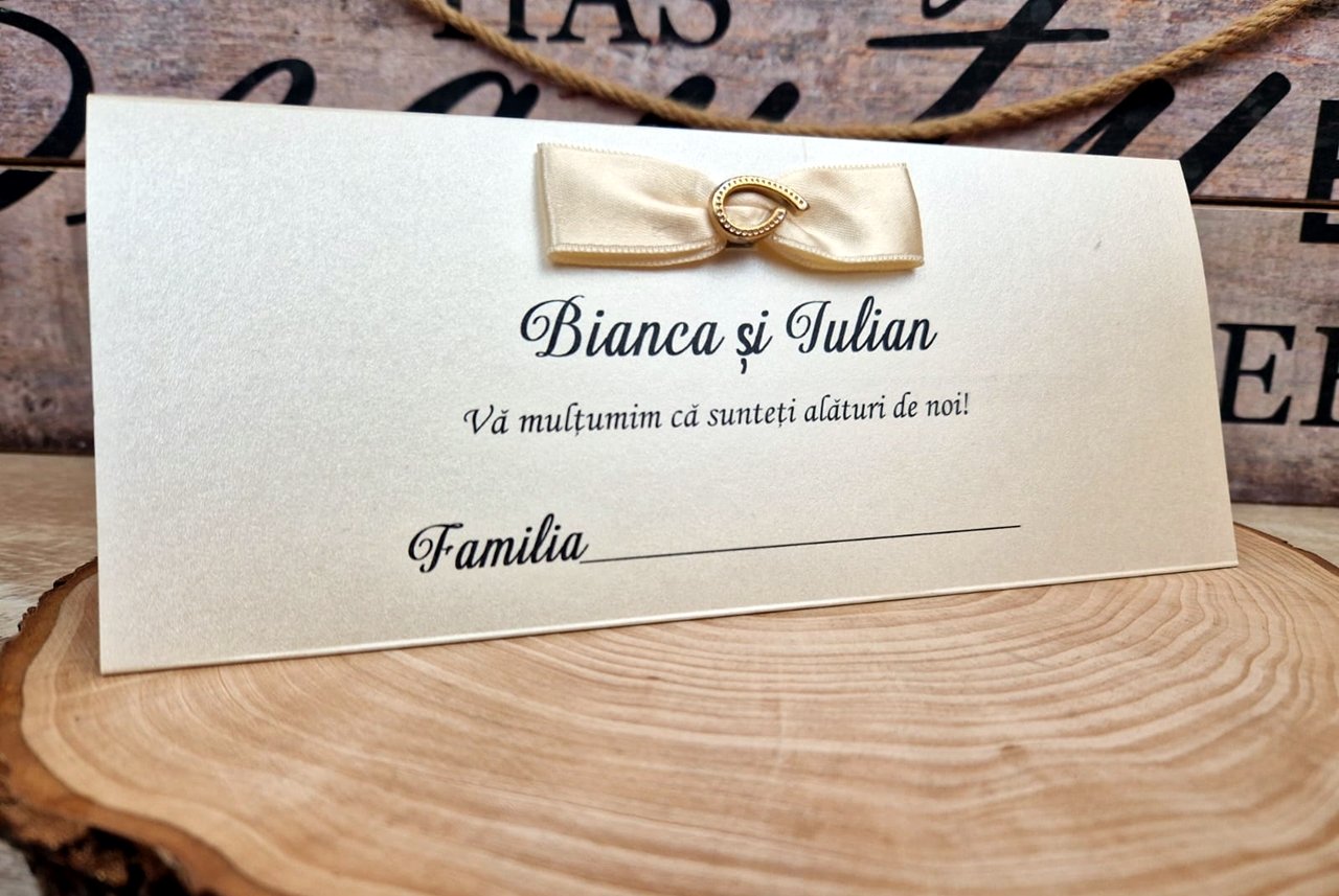 Are un dublu rol: poate fi folosit atat ca place card (pentru asezarea invitatilor la mese) cat si ca plic pentru primirea "darului".