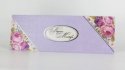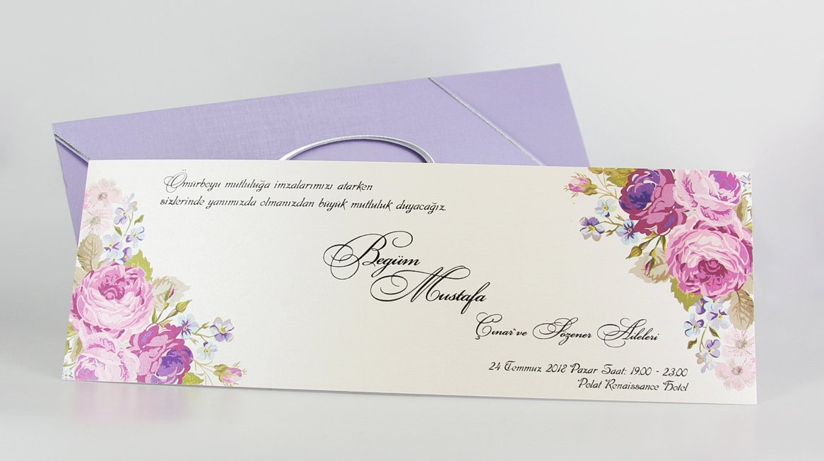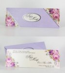 Invitatia e formata dintr-un carton crem cu margini florale destinat tiparirii textului si un plic lila cu un decupaj la mijloc pentru a se putea vedea numele mirilor.