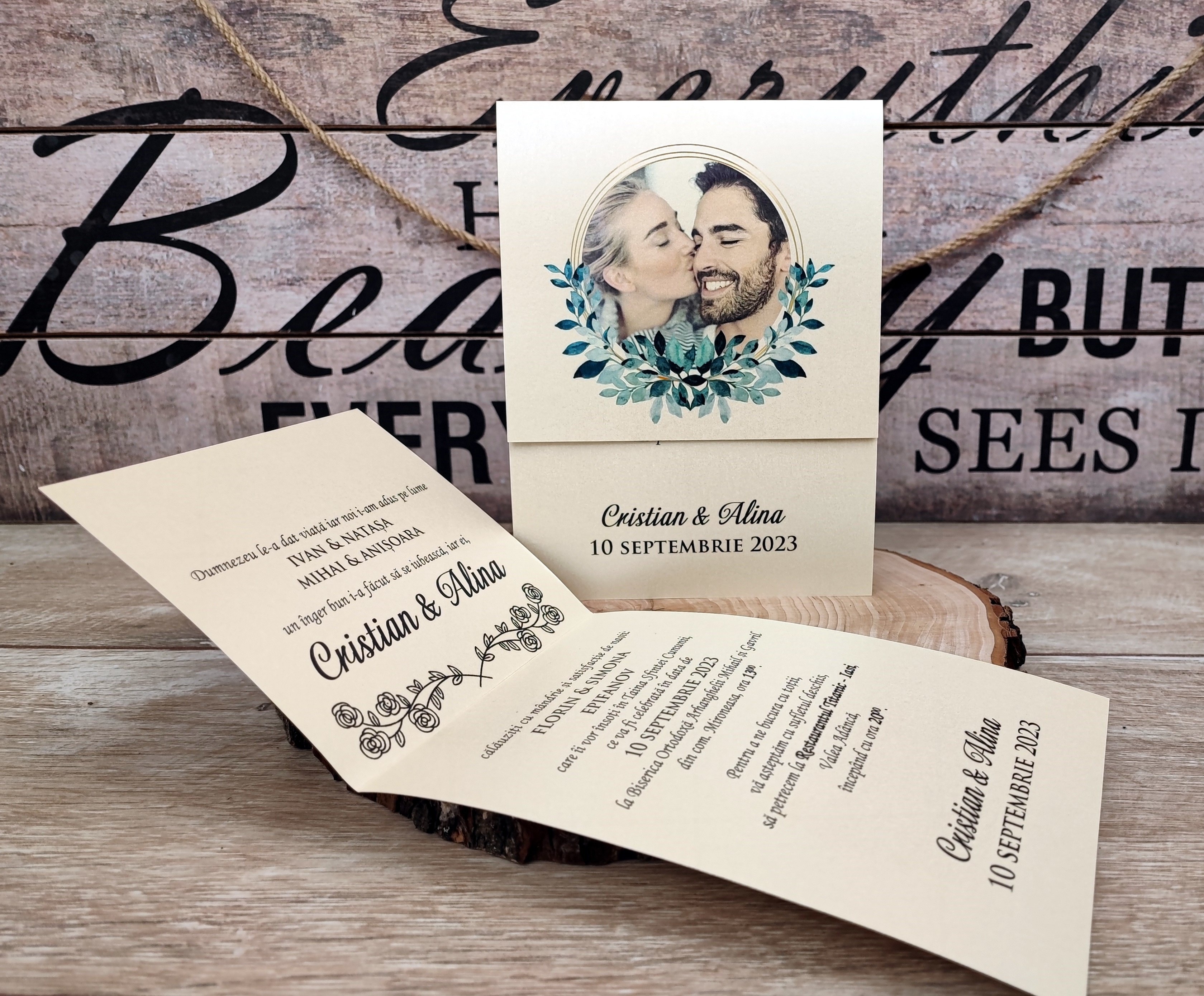 Pe fata invitatiei este printata poza mirilor, incadrata intr-o rama cu patern floral verzi.