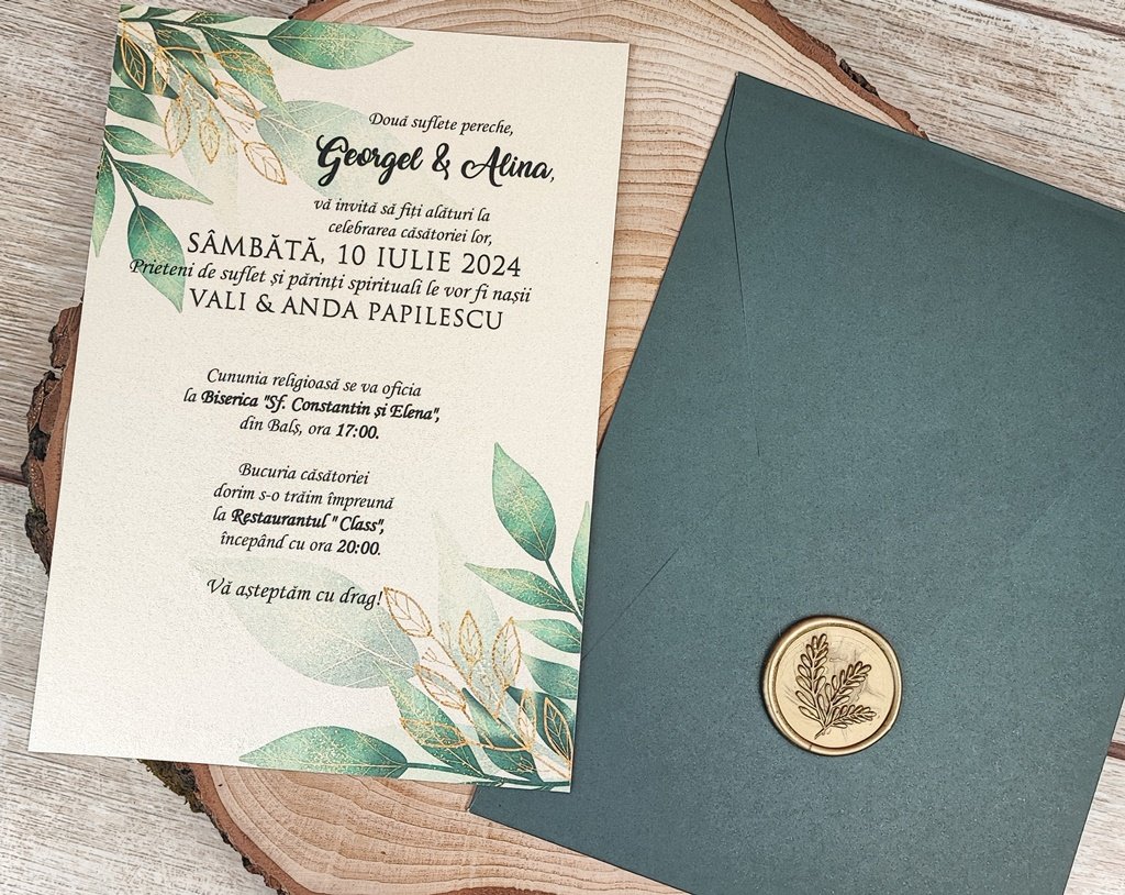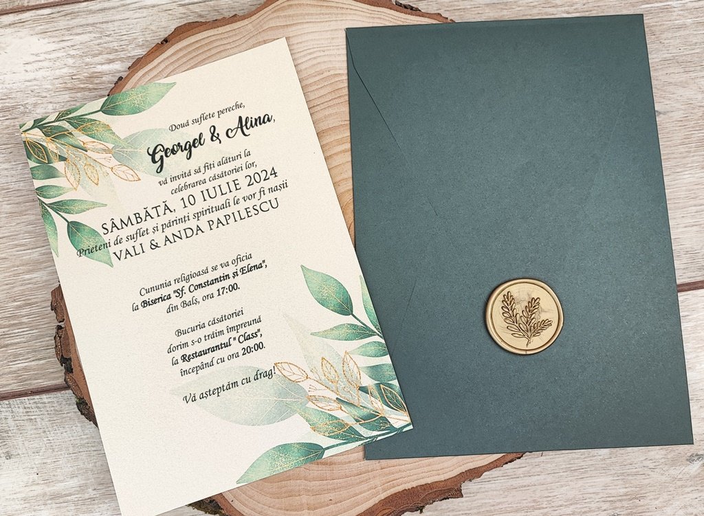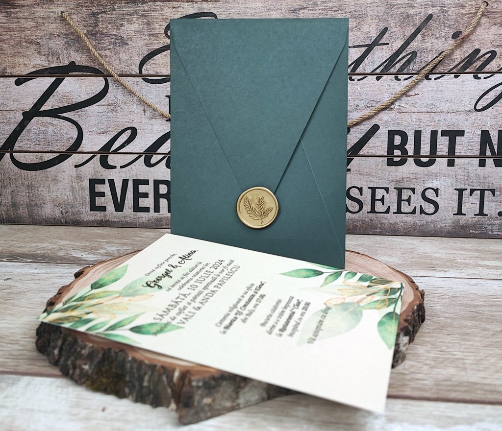 un sigiliu din ceara naturala de culoare aurie si cu model de frunze care se aplica pe plic la inchidere.