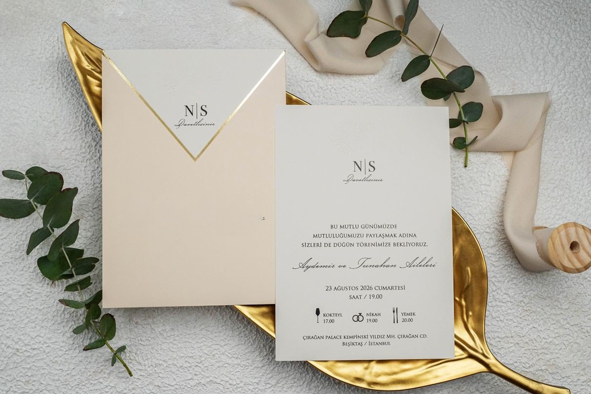 Invitatie de nunta eleganta formata dintr-un carton crem destinat textului si o coperta somon pal cu decupaj in V si margine aurie.